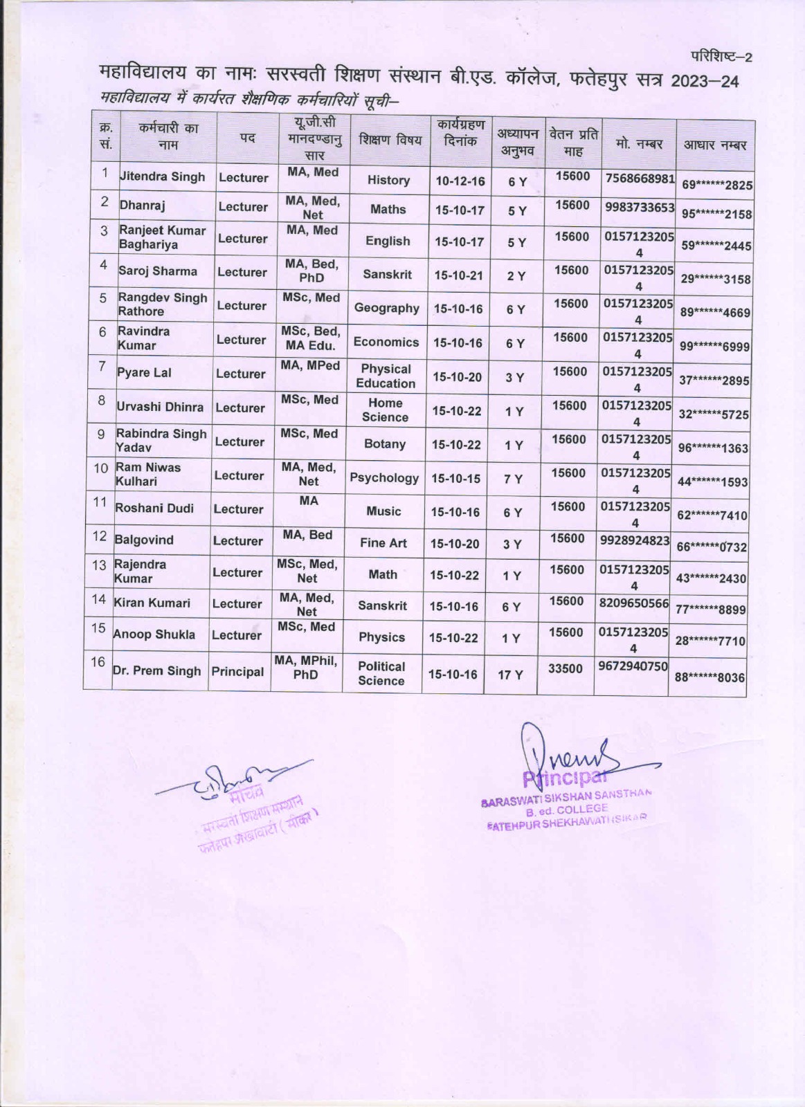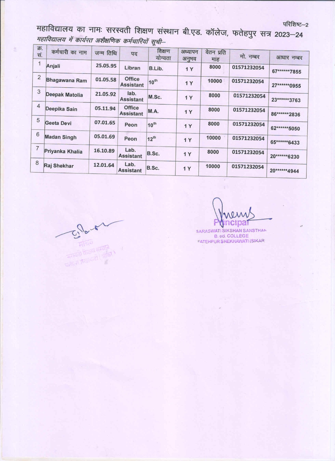 Saraswati B.Ed College which began as a modest tin- roofed building today possess an efficient infrastructure which includes spacious and well lit classrooms, Science laboratories and a language lab, library, computer room, recreation room, auditorium, and a spacious ground. The most recent addition is a hostel for women conveniently located in the college campus. Having a maximum capacity of beds, the hostel has a 24 hour security, water facility, and a mess.